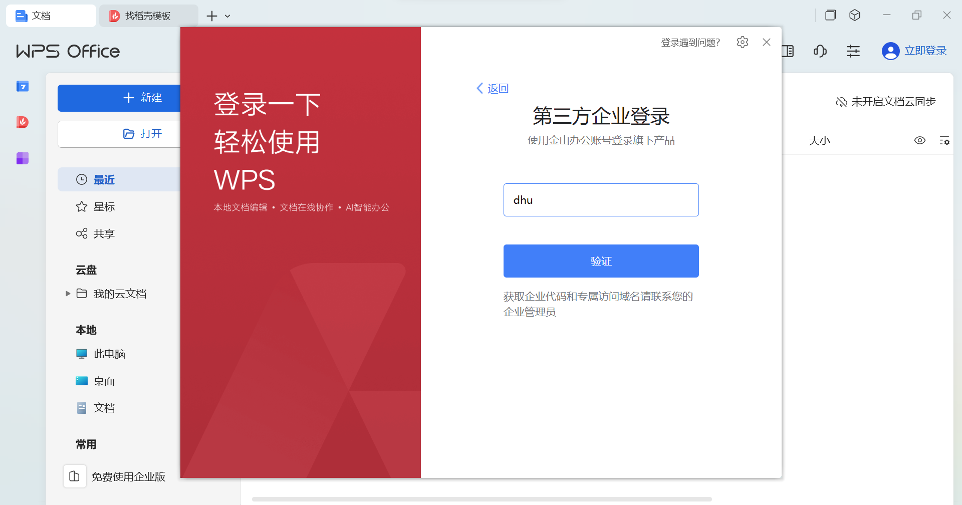 1. 打开WPS进入登录界面,选择“更多登录方式”,选择“第三方企业码”,输入“dhu”(不分大小写)验证。