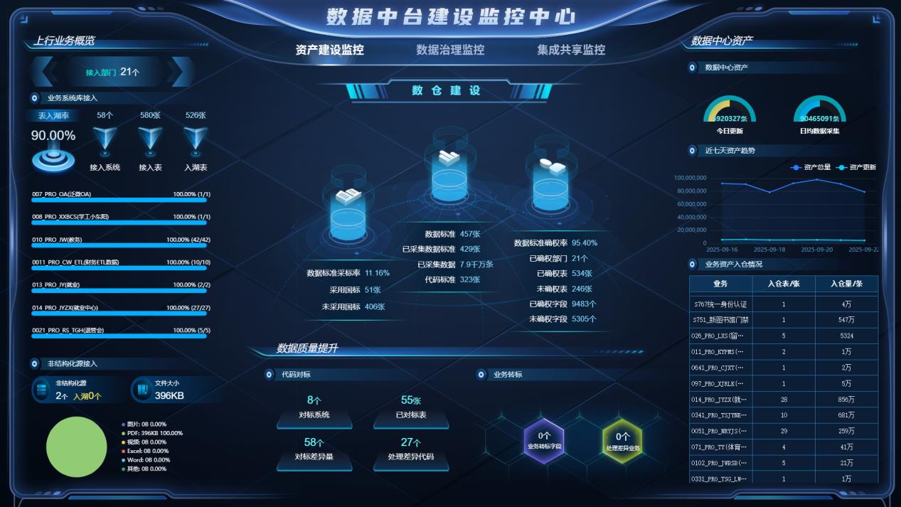 截至目前为止,平台已完成全校21个部门58个业务源的数据对接;累计完成580张数据表的采集,覆盖11,012个业务字段,数据总量达7.90千万条;数据资产中心开放数据资产总数491个,其中211个资产已实现共享;累计执行2,142个数据集成任务,完成5,975,559条数据共享交换,为业务系统协同提供数据支持。
